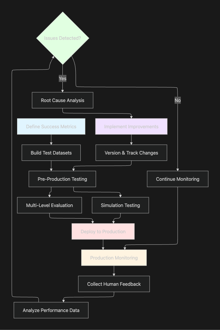 | 6. Monitor Production | Continuous Oversight | Track quality, cost, latency, and safety in live environments | Real-time dashboards and automated alerting |