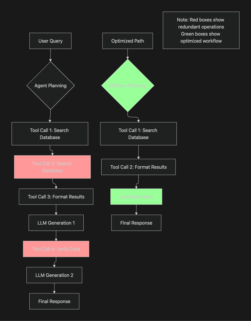 Agent trajectory analysis reveals common inefficiency patterns contributing to latency. Production logs frequently show agents making redundant tool calls with identical parameters due to poor state management, executing unnecessary intermediate reasoning steps that consume inference cycles without advancing task completion, and following suboptimal solution paths before backtracking to viable approaches.
