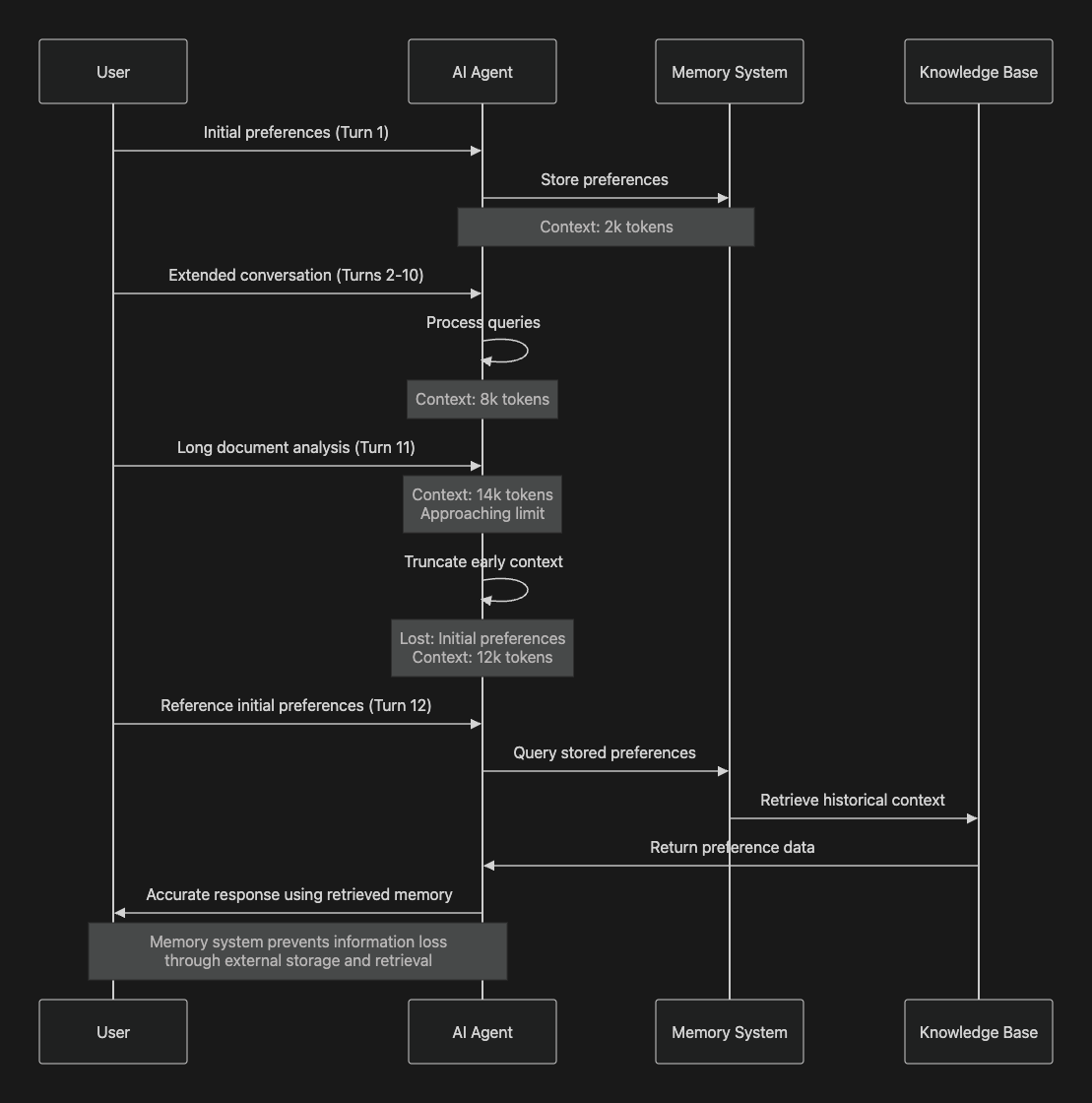 Retrieval-augmented memory systems query external knowledge bases to access information beyond immediate context windows. When agents detect references to previous interactions, they retrieve relevant conversation segments rather than maintaining everything in active context. This approach scales to arbitrarily long interaction histories while preserving access to historical information.