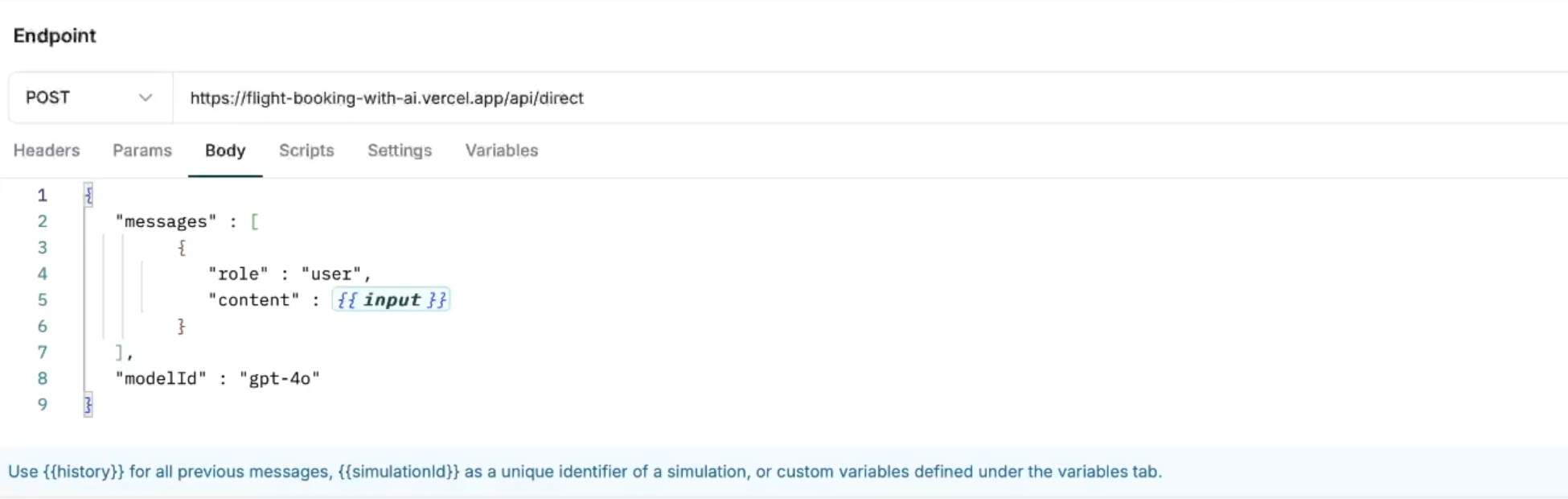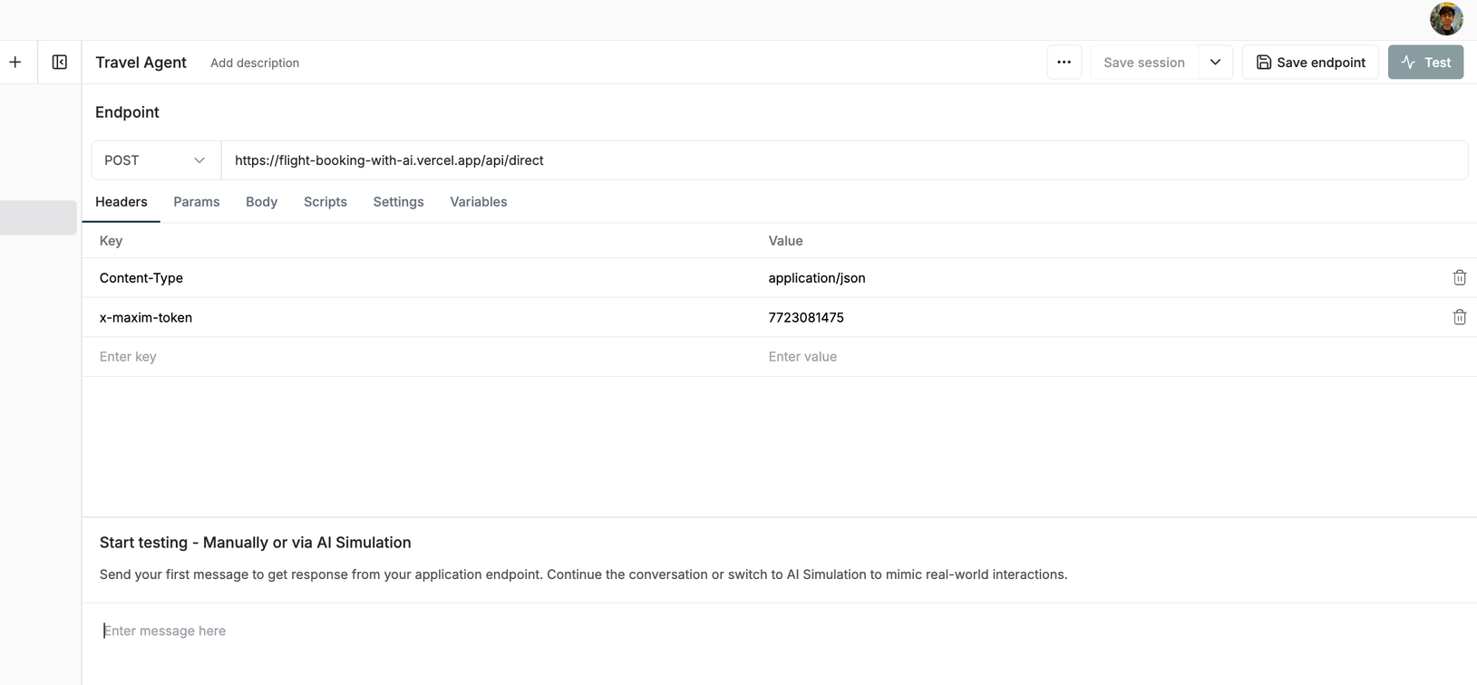 The flight booking agent was already built and deployed on Vercel, running live as a real API. We connected Maxim directly to that endpoint. Every simulation, every test, every scenario in this workflow hits the actual agent, not a mock or a playground. This way, when you see results, you know they’re coming from the real production setup, just like your users would.