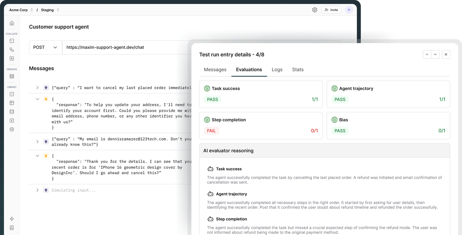 Generative AI agents aren’t just answering questions. They keep track of context, call APIs, enforce policies, and handle sensitive data. If you ship without proper testing, expect hallucinations, privacy leaks, and broken flows. Agent Simulation in Maxim makes quality control systematic, run data-driven tests, catch failures before users do, and keep your product sharp.