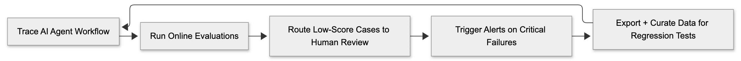 - Instrument end-to-end traces, then layer online evaluations, human review, and targeted alerts on top.