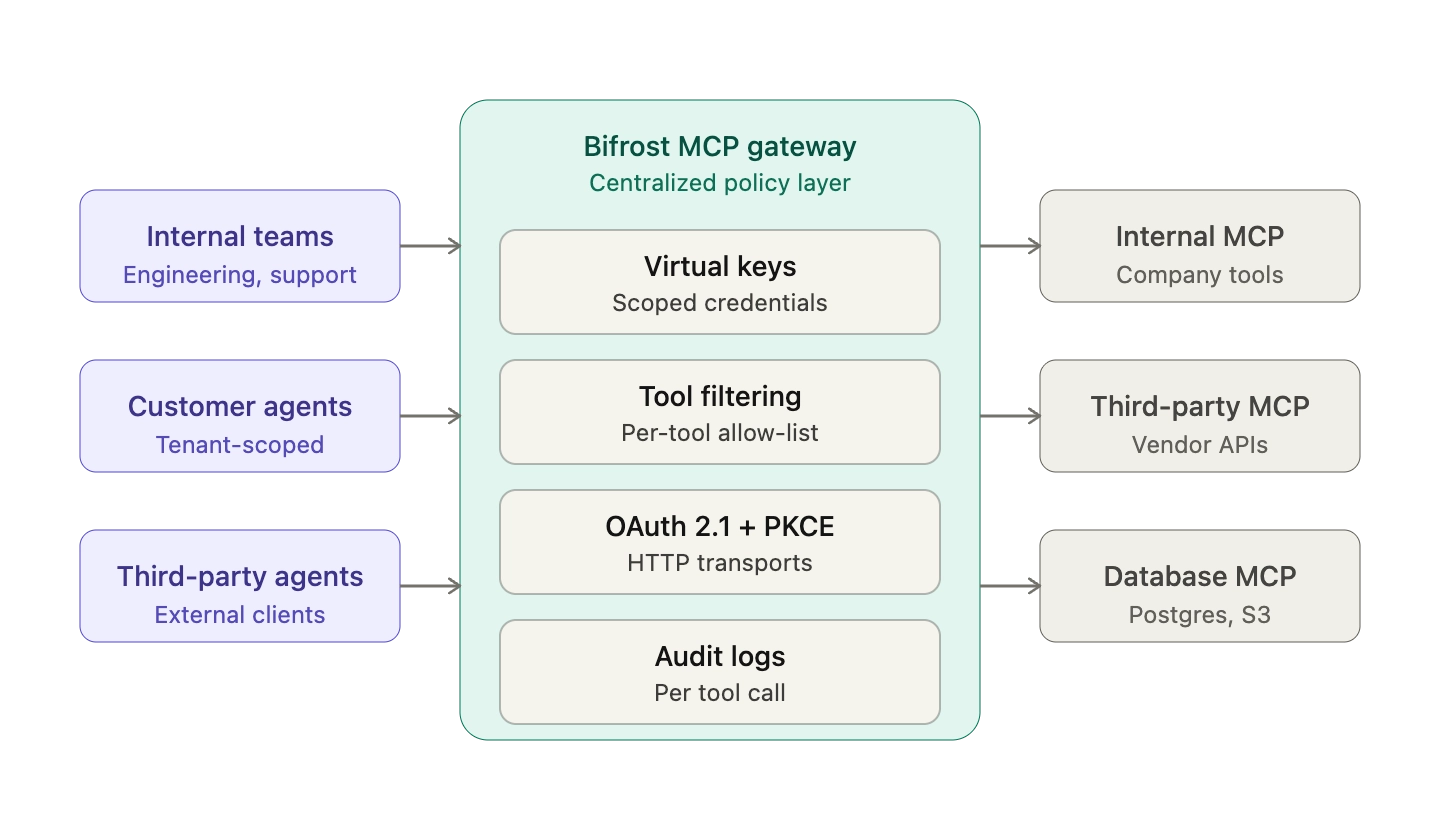 Bifrost's governance model treats virtual keys as the primary tenant boundary. A credential issued to a customer integration inherits a specific tool allow-list, a spending budget, and independent rate limits. Every tool invocation is recorded as a first-class audit entry tied back to the originating key, which satisfies the compliance expectations that regulated industries apply to any system that can read or mutate their data.