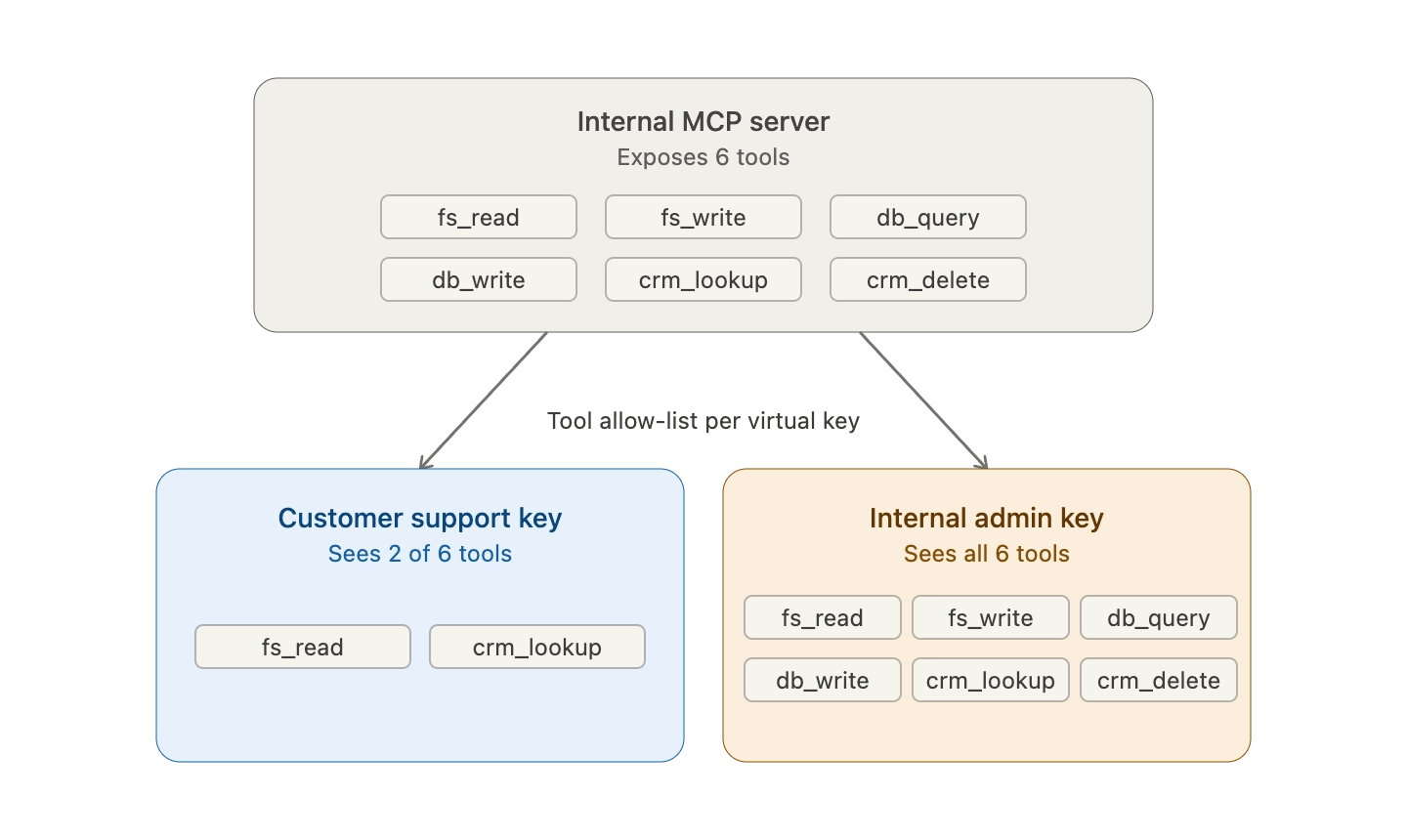 - Virtual keys scope credentials per consumer with per-tool allow-lists, budgets, and rate limits.