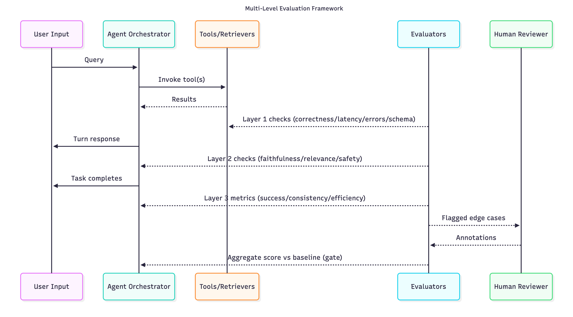 AI agents operate at multiple levels of granularity. A single user query might trigger multiple LLM calls, tool invocations, and retrieval operations. Evaluation frameworks must measure quality at each level to identify specific failure points.