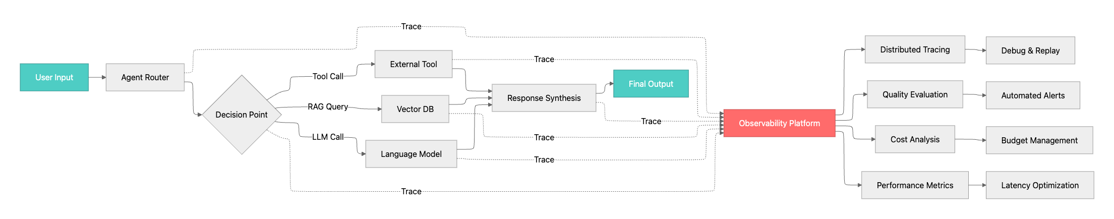 Without observability, debugging becomes a guessing game. Teams waste countless hours trying to reproduce issues that may only occur under specific conditions or with particular user inputs. With proper observability, engineers can replay traces, examine decision points, and understand exactly where and why failures occurred.