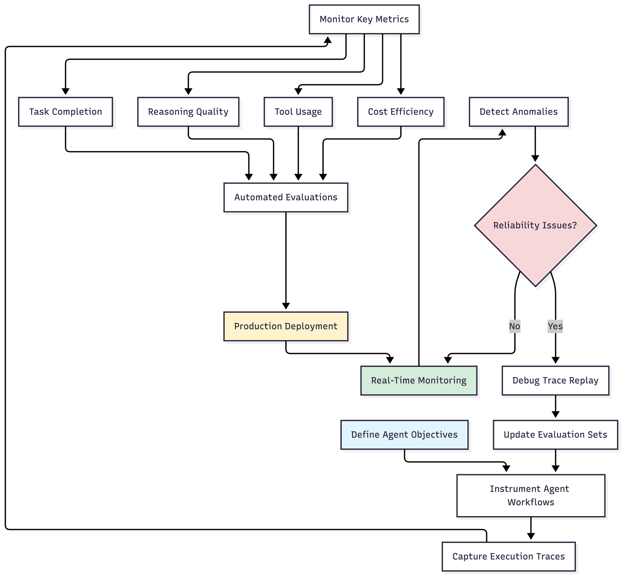 Implementation Steps: Define agent objectives and success criteria. Instrument workflows with comprehensive tracing. Establish baseline metrics for task completion, reasoning quality, and cost efficiency. Deploy automated evaluations in testing environments. Enable production monitoring with real-time alerting. Create feedback loops, adding failures to evaluation datasets.