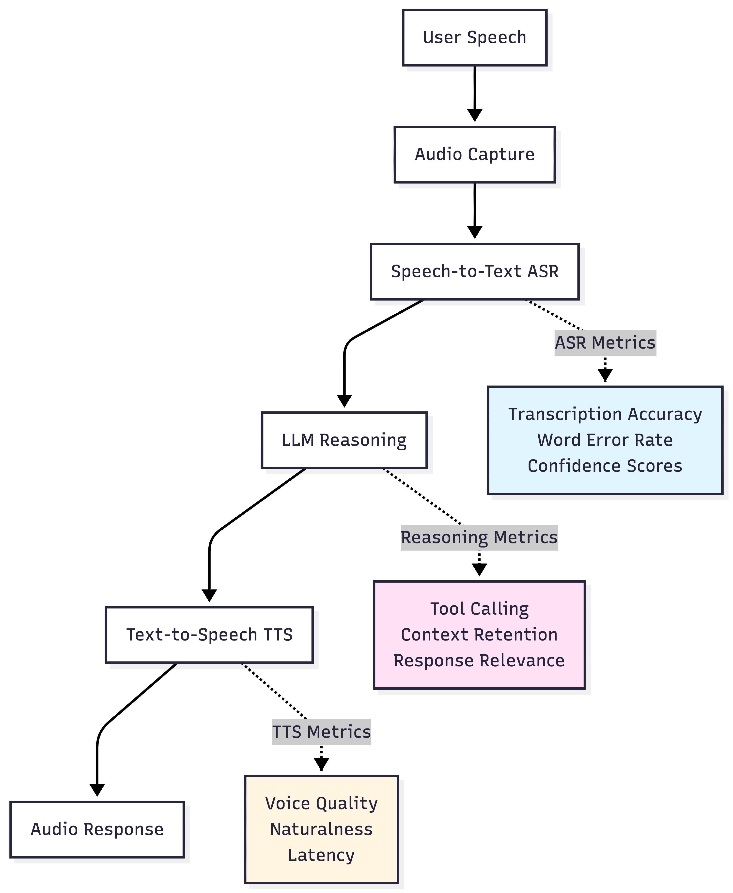 Traditional text-based evaluation metrics fail to capture voice-specific quality signals. Tone, hesitation, sighs, and frustration manifest in audio but disappear in text transcripts. Evaluation platforms must process actual audio to detect these critical quality indicators.