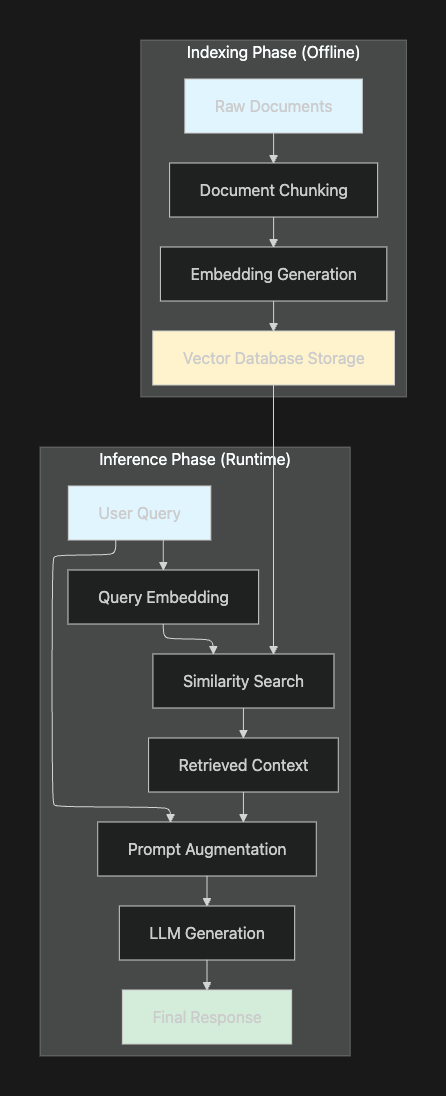RAG pipelines consist of two distinct phases that work together to deliver context-aware responses.