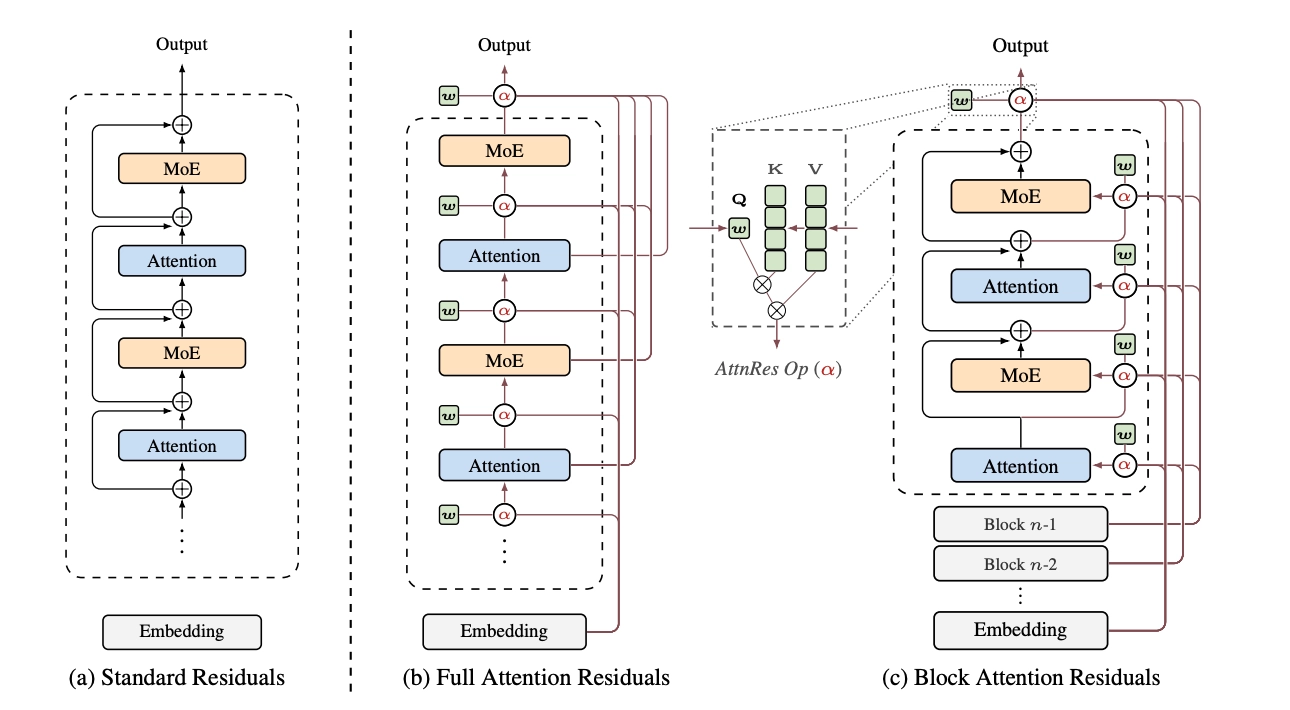 AttnRes is not a radical departure from the transformer architecture. It's a targeted intervention on one specific component, the residual connection, that has remained essentially unchanged since 2015. The implementation is simple enough to fit in a few dozen lines of PyTorch. The overhead at inference is under 2%. And it fixes a real, theoretically motivated problem: uniform accumulation causing dilution, information loss, and uneven gradient flow.