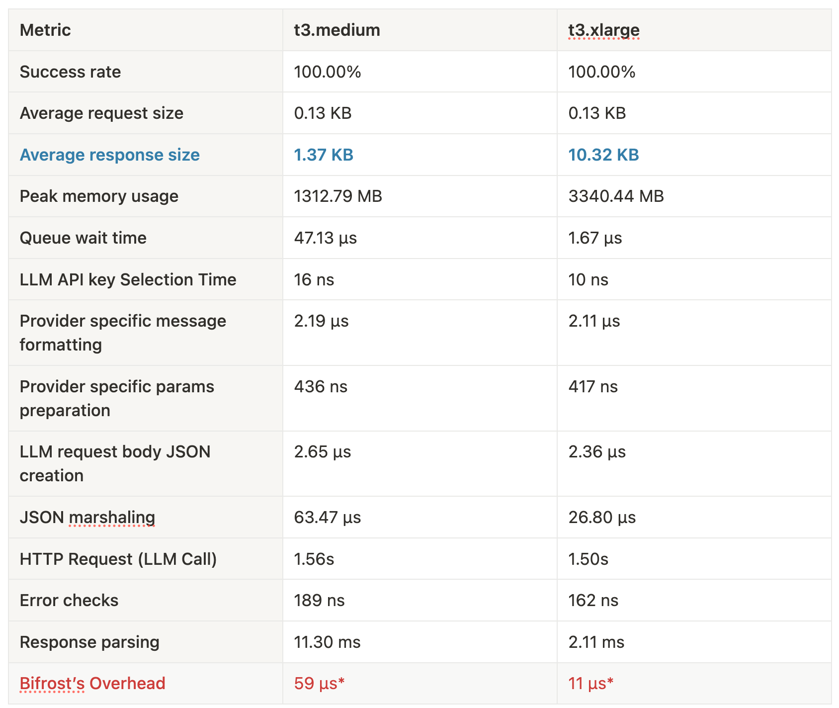 Note: On thet3.xlarge, we tested with significantly larger response payloads (~10 KB average vs ~1 KB ont3.medium). Even so, response parsing time dropped dramatically thanks to better CPU throughput and Bifrost's optimized memory reuse.