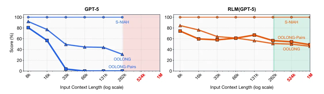 The researchers tested RLMs on two challenging benchmarks where modern frontier models struggle: