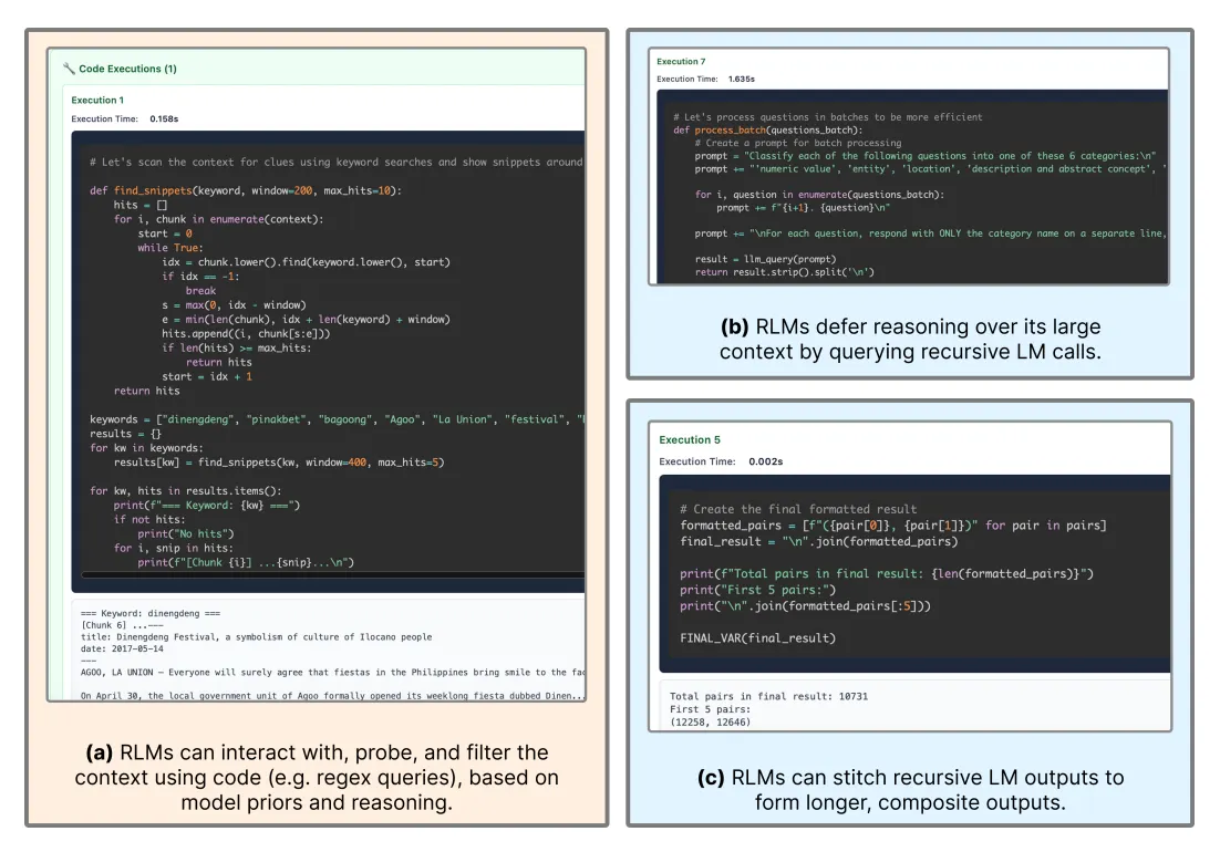 One of the coolest aspects of RLMs is interpretability: you can watch how the model breaks down its task. The researchers observed several emergent strategies:
