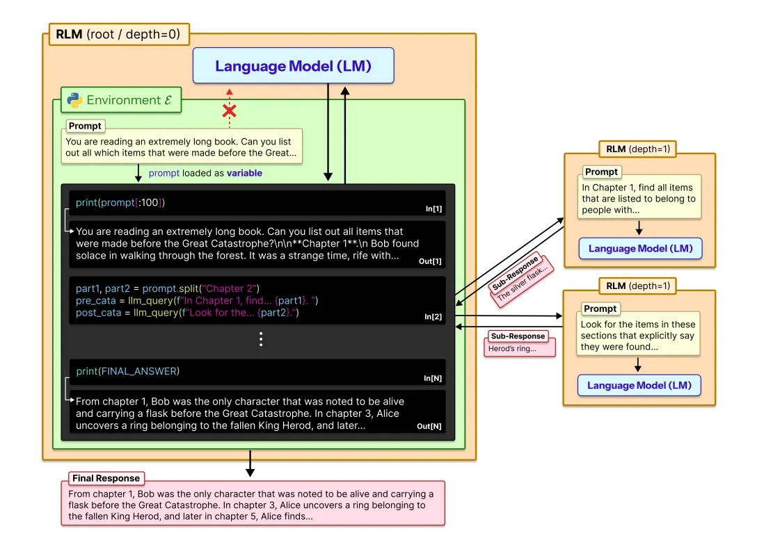 Think of it like this: instead of asking a model to read and memorize a 500-page book before answering a question, you give it the question and let it interactively explore the book, peeking at sections, searching for keywords, and asking sub-questions to itself about specific passages.