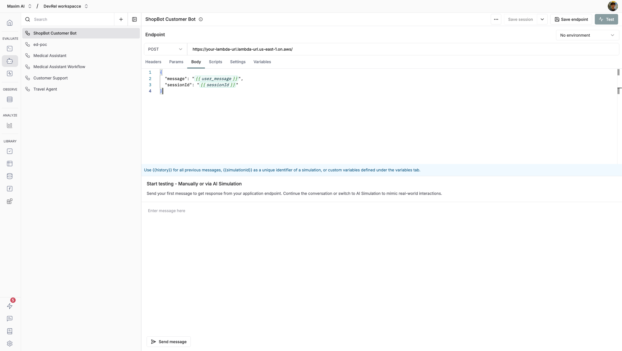- In Maxim, go to Evaluate → Agents via HTTP Endpoint