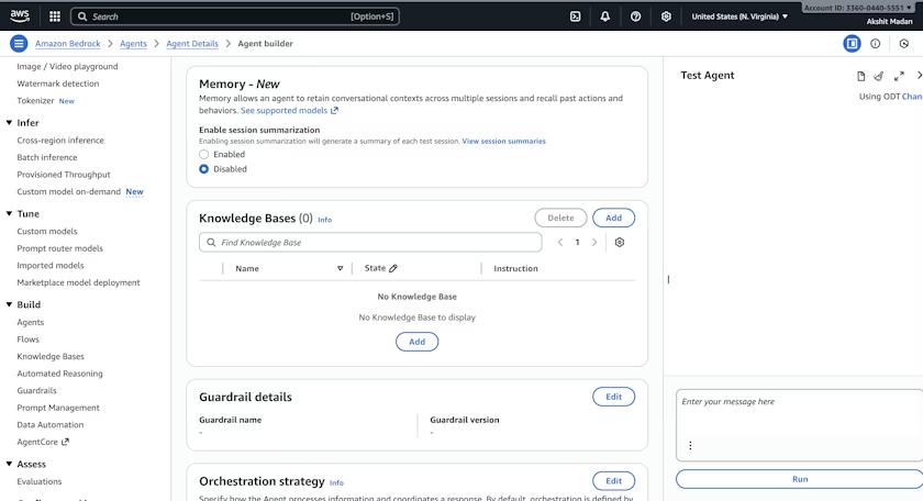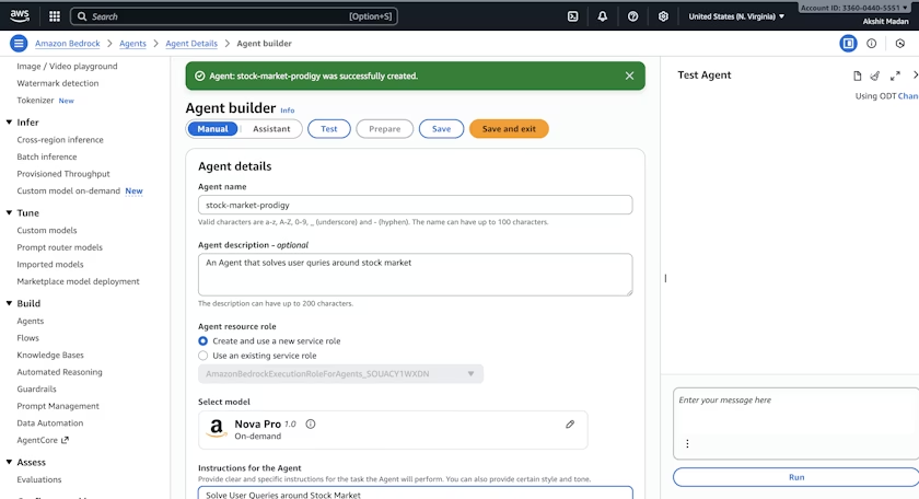 Navigate to Amazon Bedrock in the AWS Console and go to Agents in the left sidebar.