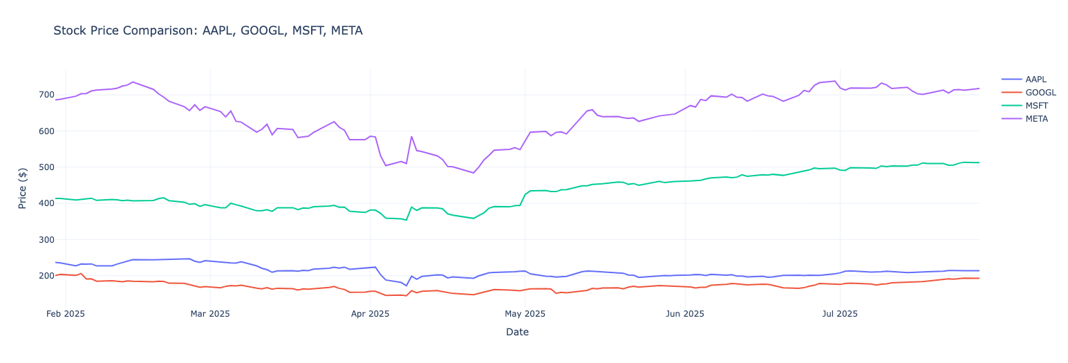 - Generate stock price charts from queries like "Show me Apple's performance over the last 6 months"