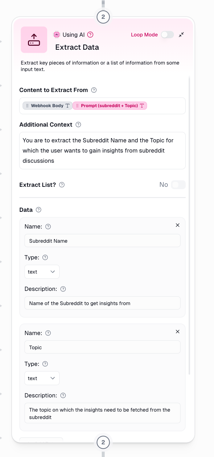 We will connect the webhook and the interface nodes with the extract data node so that we can use an LLM to extract the name of the subreddit and the topic the user wants to get insights on from reddit. The image below features how I did it in my own workflow. You could play with the Additional Context Prompt or make this more exhaustive by adding more parameters or optional tweaks to make your system even more intensive.
