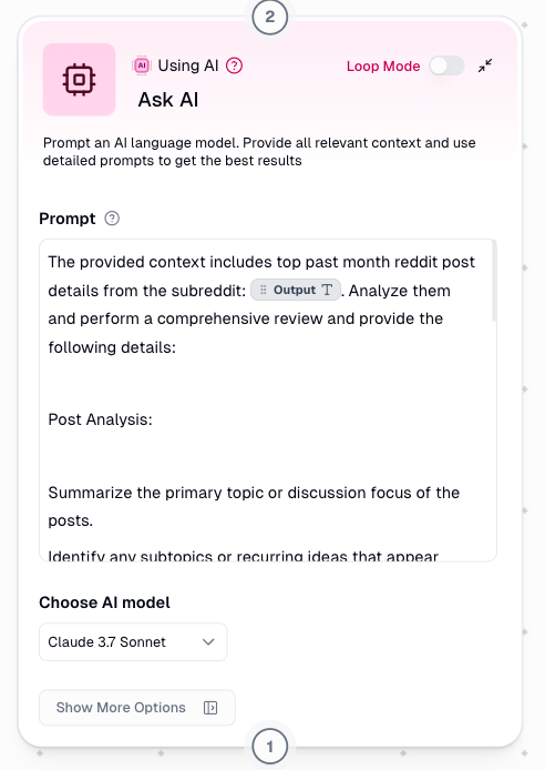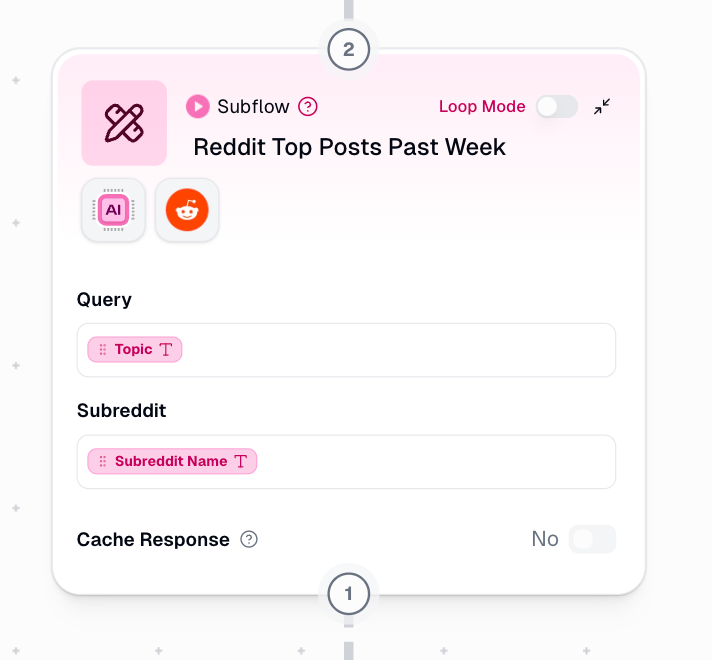 We will use the extracted subreddit and the topic in a subflow to get posts, process them and return us the response. In order to keep the workflow simple we will be using a gumloop subflow node. You could add more subflows to implement more complex logic and operations in your workflow.