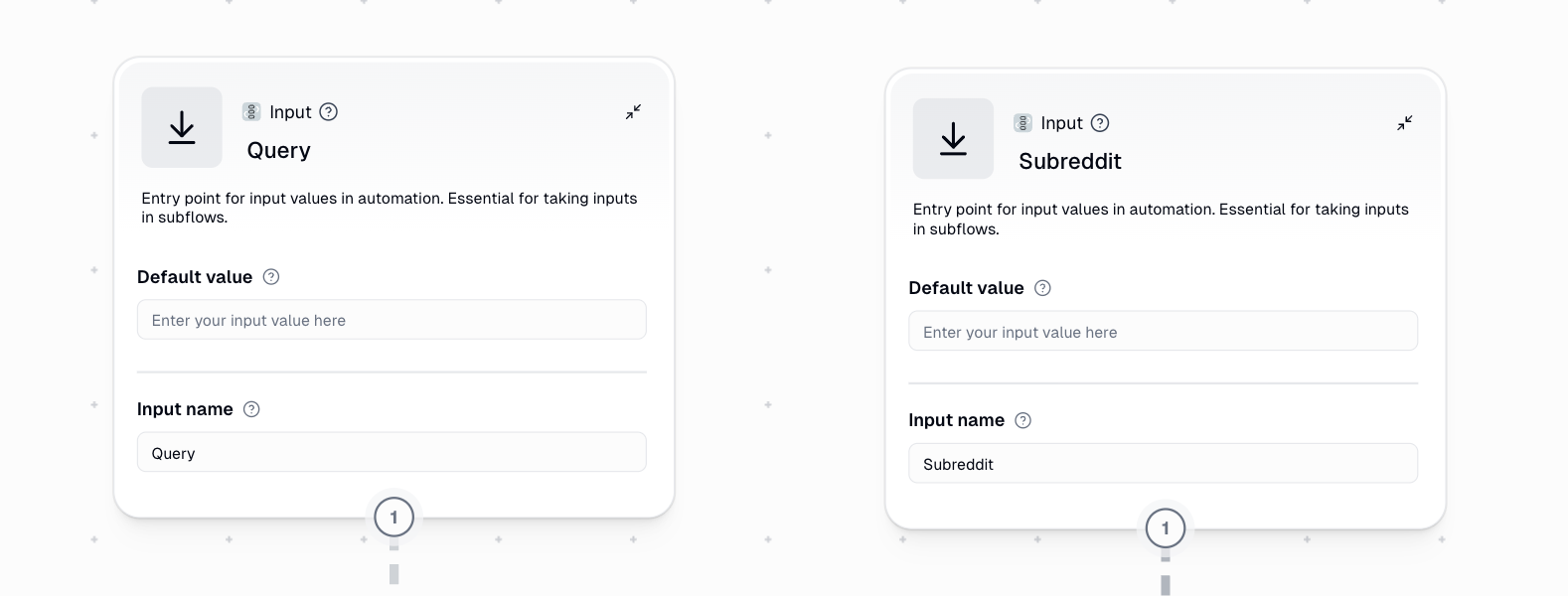 Our subflow takes in two inputs, the name of the subreddit and the query topic.