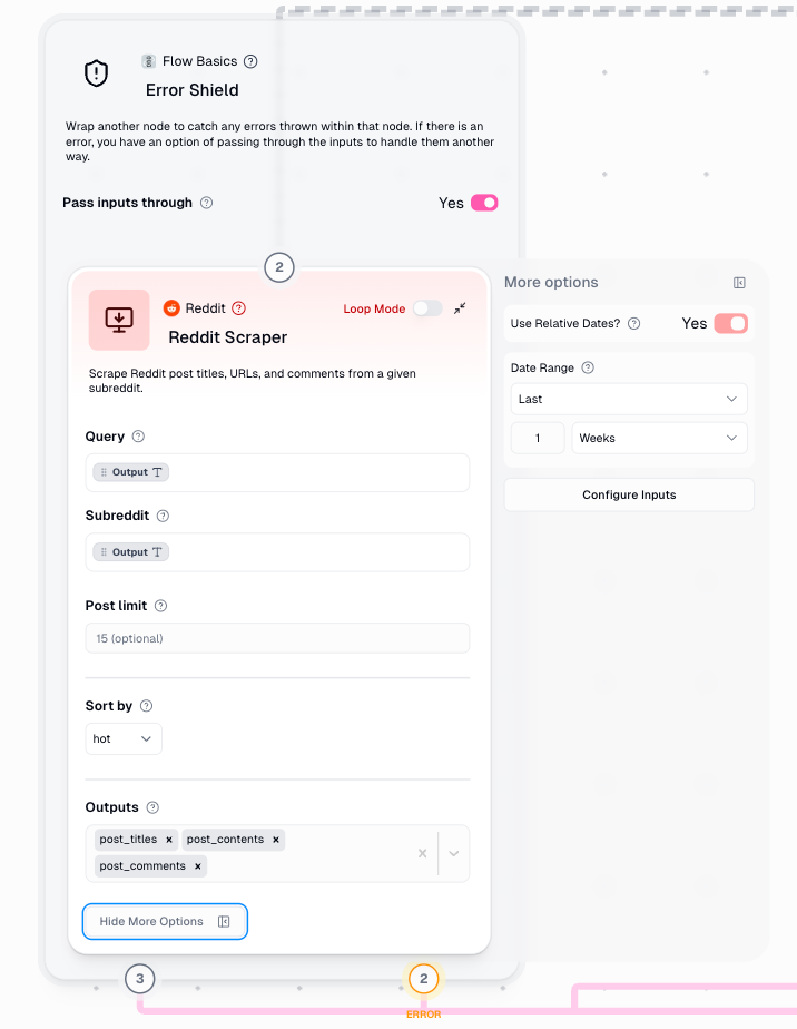 We wrapped a Reddit Scraper node in an Error Shield node to make sure that, in case the reddit scraping node faces an issue, we are able to handle the errors graciously. We pass the Subreddit and the Query to the Reddit Scraper node, select last 1 week as the Data Range and sort the posts by their engagement. So that we only fetch the posts that are the most engaging. Optionally, you could add a limit to the number of posts you want to fetch.