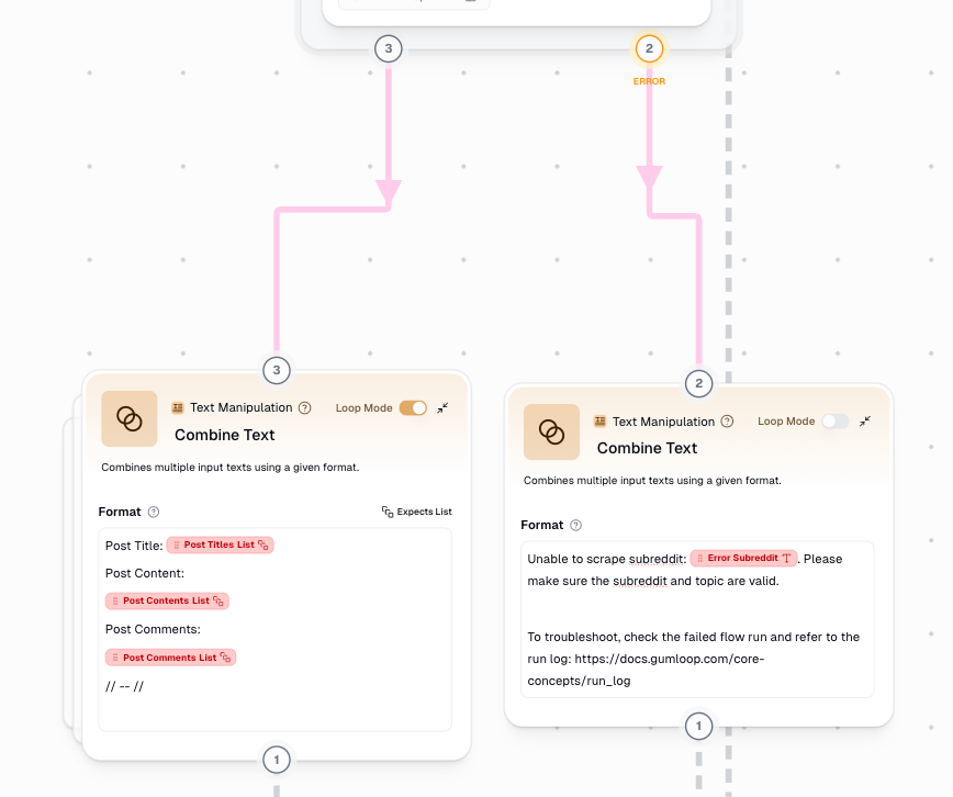 We connect the Output and the Error endpoints of the Error Shield Node and connect them with two text manipulation nodes, the 1st node creates a list of Reddit Posts configuring the post titles, content and the comments into a uniform structure and the second node handles the errors and returns a standard message in case the workflow fails to scrape reddit, either due to a mistake in processing the query or due to unavailable data for the query.