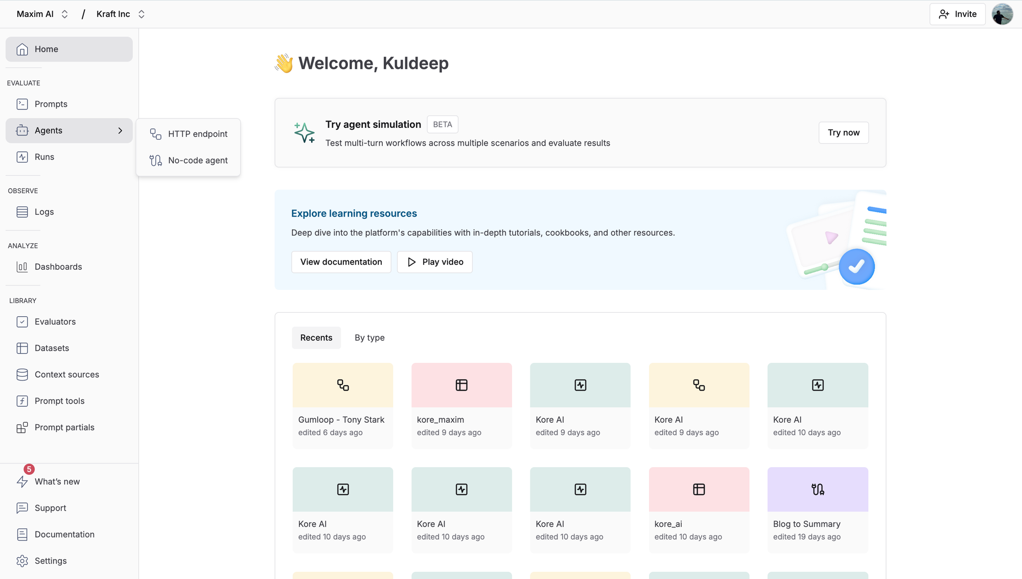 First we need to login to Maxim Login, if you don’t have an account yet, you can sign up for a free account using Maxim Signup. Once inside you can navigate to the Agents Tab and select HTTP endpoint.
