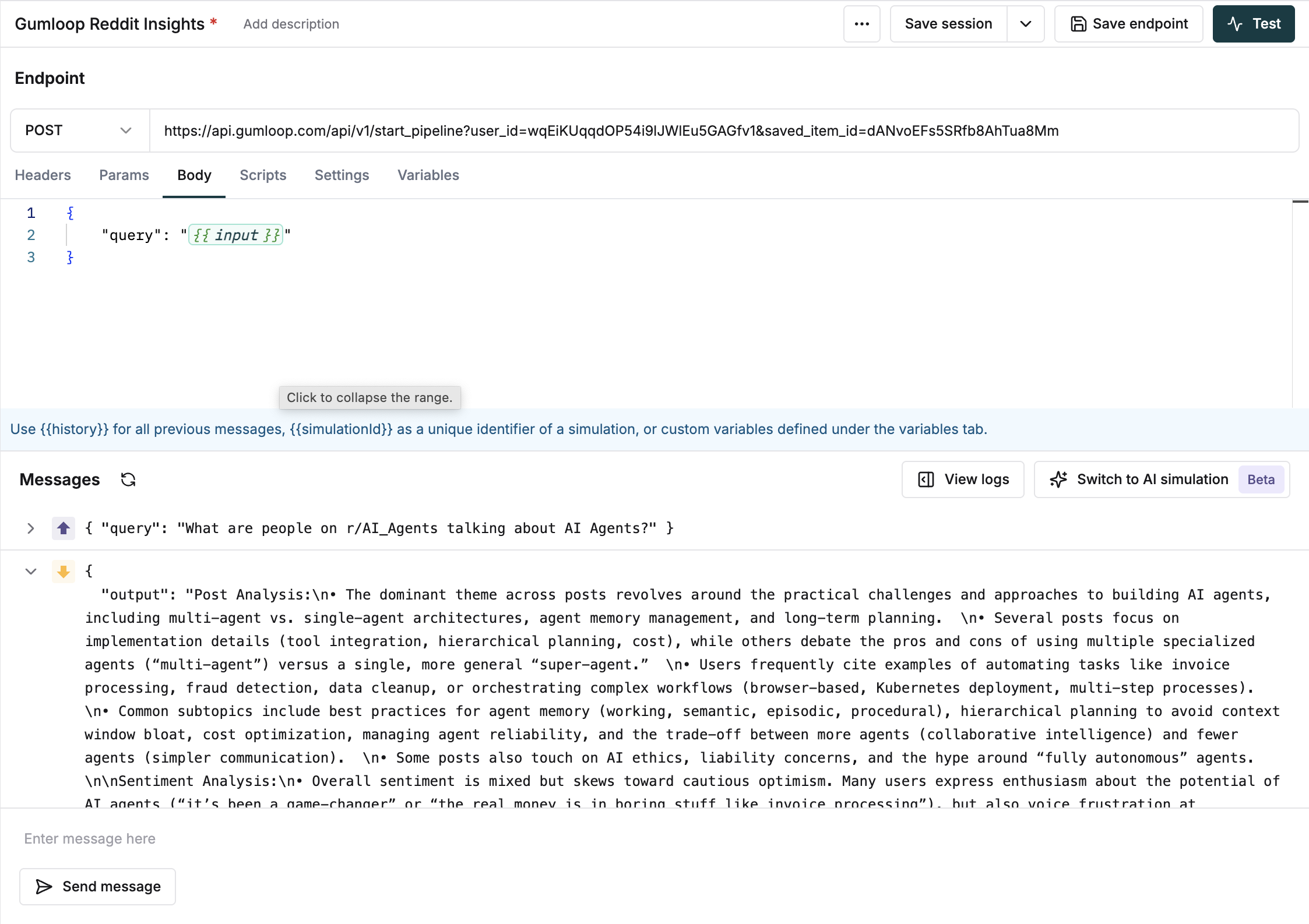 We want this workflow to be accessible to all of our team members who could query reddit in simple english mentioning the subreddit and the topic of choice. Our end-goal is to have a workflow that could be triggered by simply writing “What are people talking about in r/AI_Agents on AI Agents” and the Workflow should be able to fetch relevant posts from Reddit, analyse the posts and return a detailed response.