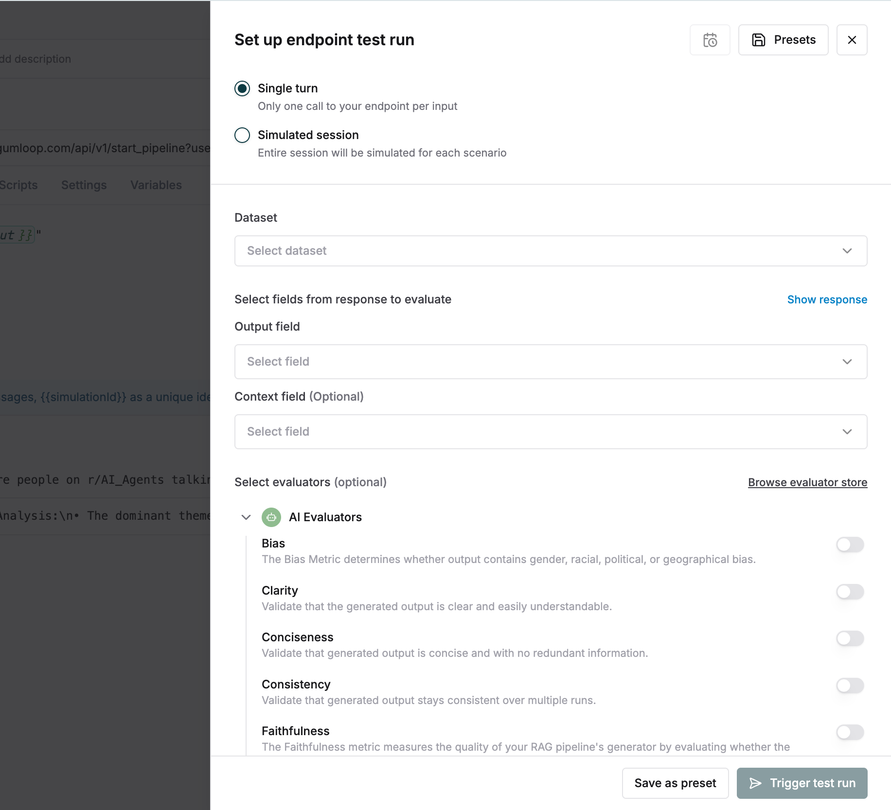 After adding the inputs to the dataset, we can select the Preset we had saved earlier and Trigger the test run.