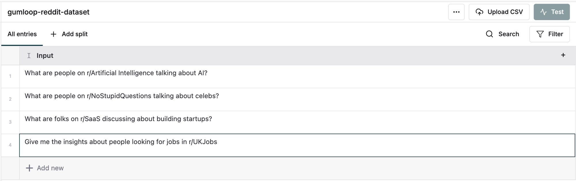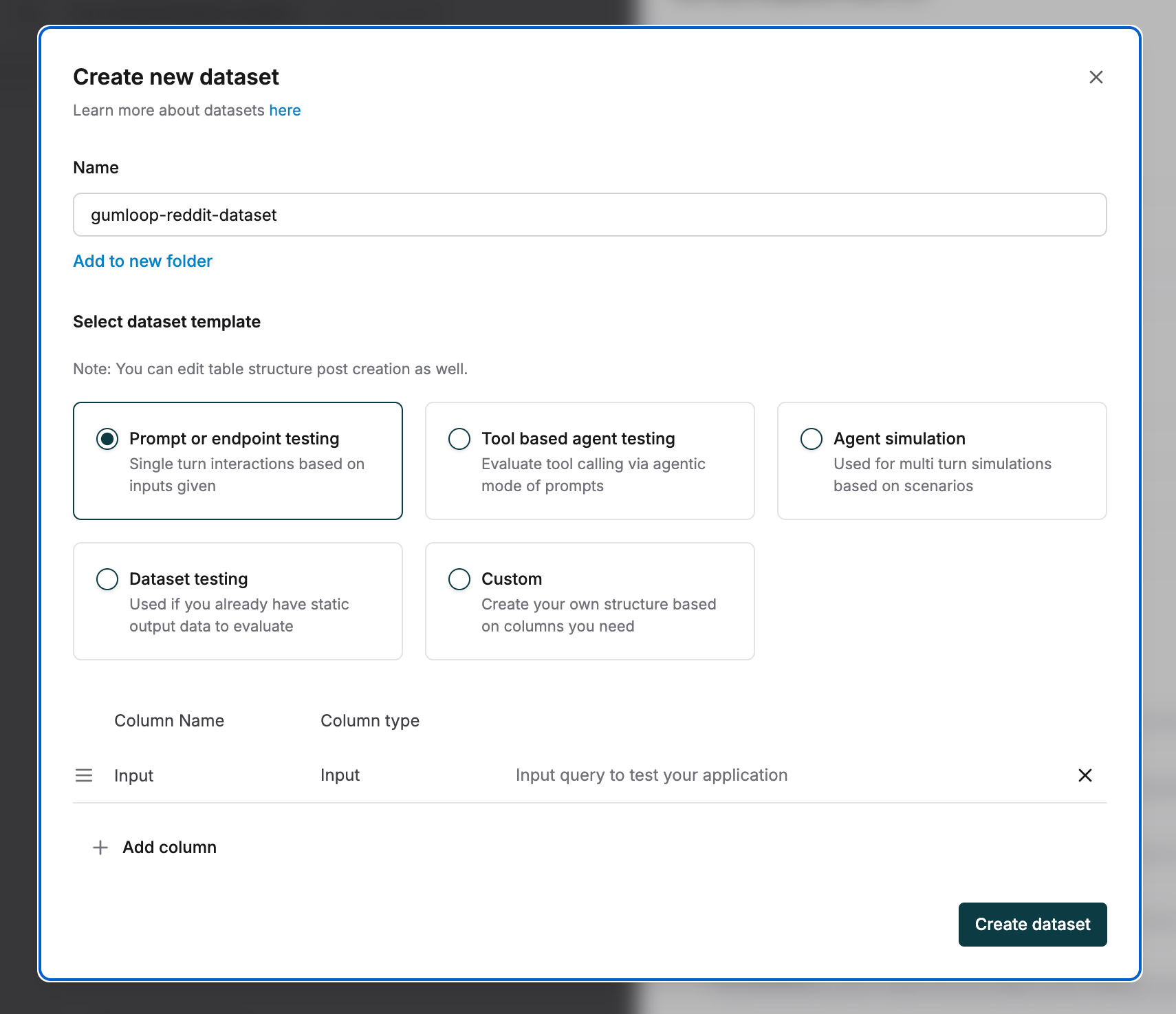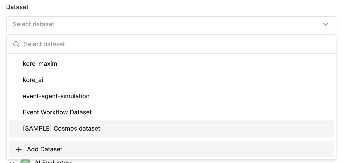 We need to create a dataset containing a few sample inputs we would want our workflow to test out. We can do this by clicking on the Select dataset selector and then clicking on “Add Dataset”.
