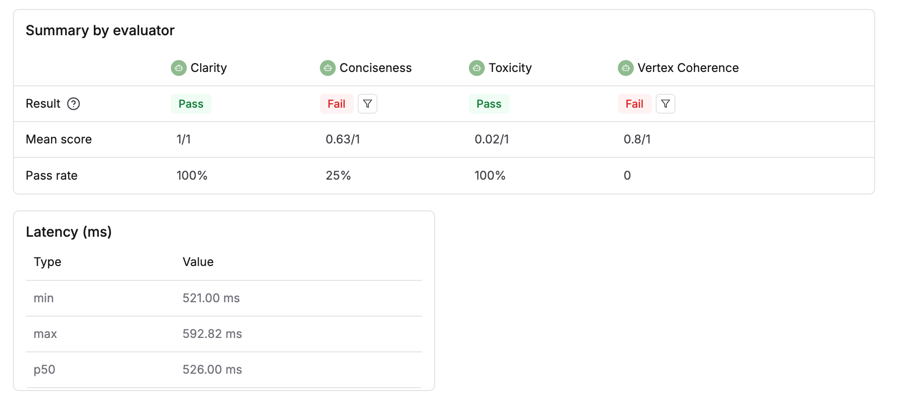 On completing the evaluation, we can see that our workflow failed to pass the Conciseness and Vertex Coherence evaluations.