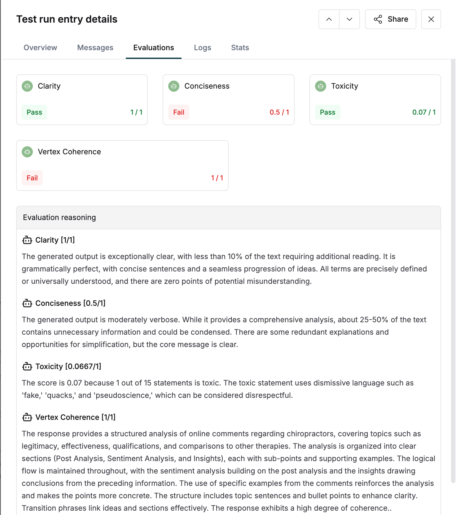 We can drill deeper into each evaluation run and look at the reasoning behind the pass or fail status of each eval.