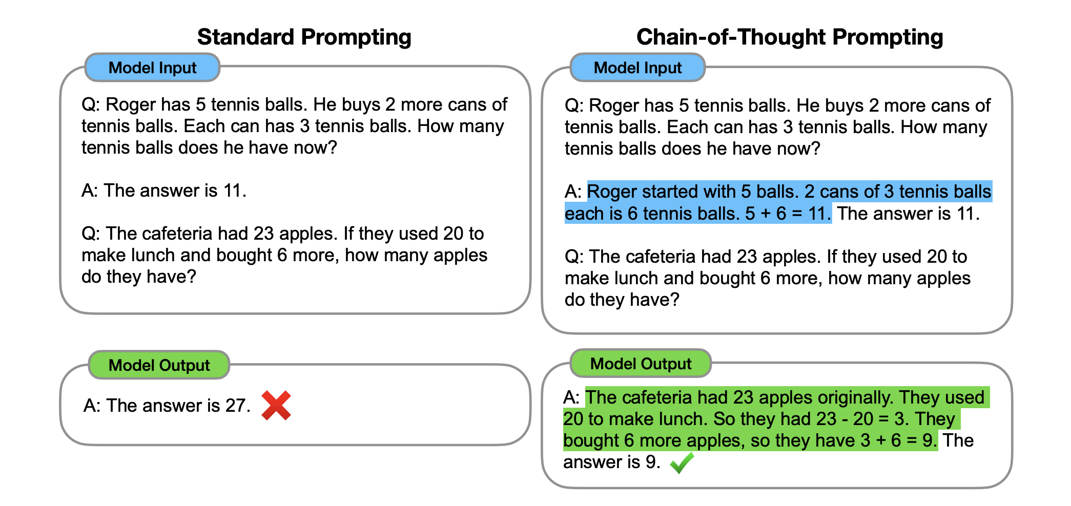 Without CoT prompting, a model might provide the correct answer without explaining how it arrived. CoT prompting, on the other hand, encourages the model to provide a step-by-step breakdown, such as: