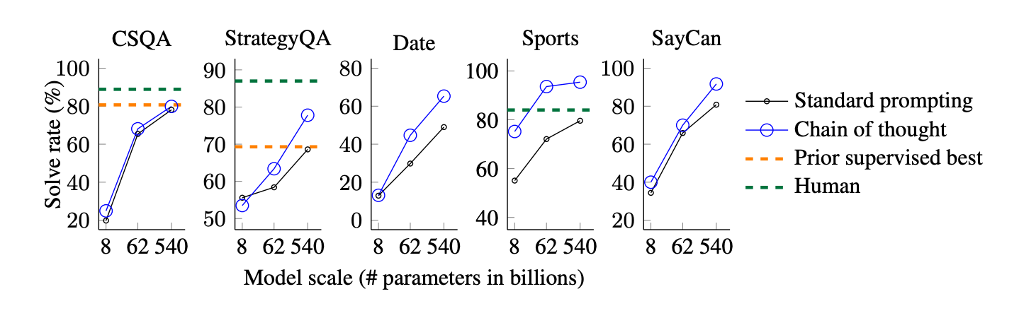 - Applicability across domains: While CoT is especially powerful in arithmetic reasoning, its principles can be applied to various other tasks. Commonsense reasoning, for instance, benefits from CoT by allowing models to connect seemingly unrelated pieces of knowledge through a logical thought process.