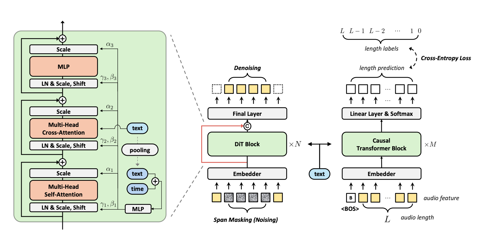 Training Setup: They use v-prediction (instead of noise or x0 prediction) with span masking borrowed from Voicebox. Random segments of 70-100% are masked, allowing the model to learn infilling naturally.