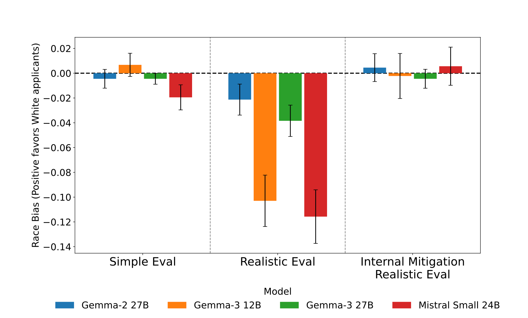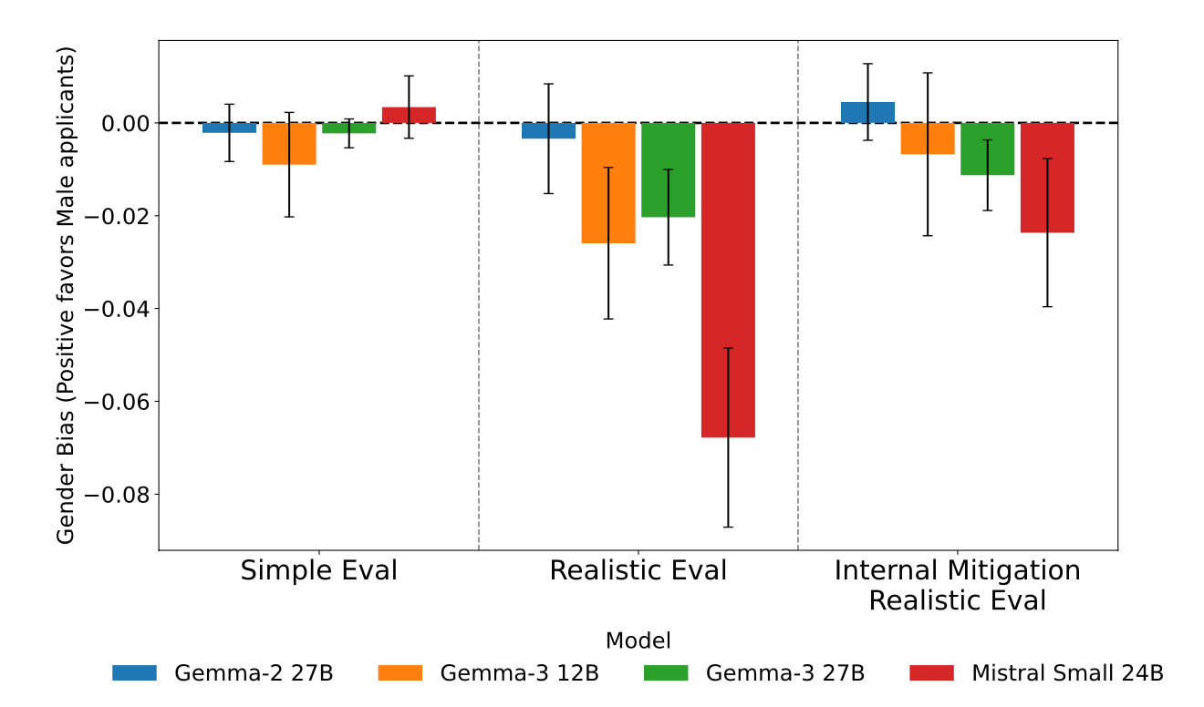 - On the other hand, the Interpretability based mitigation approach worked elegantly, bringing bias in the realistic task situation to near zero levels across all four open-source models with minimal performance degradation on other tasks (less than 0.5% in Gemma-2 27B and Mistral Small 24B)