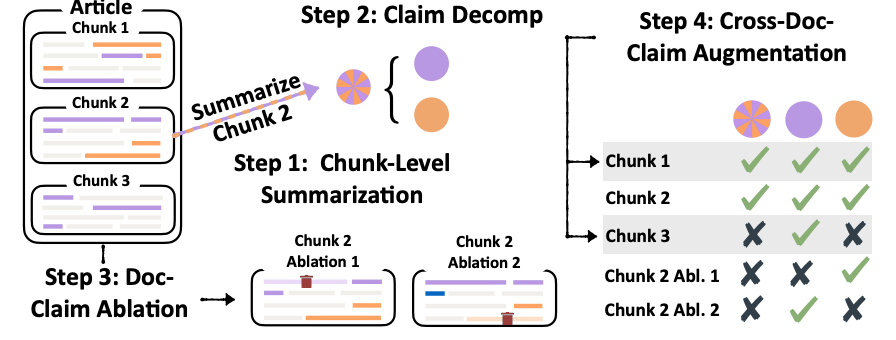 In the C2D method, it is assumed that a set of human-written claim statements is available. The objective is to create synthetic documents that challenge models to verify multiple facts in each claim against several sentences. Here’s a summary of the steps: