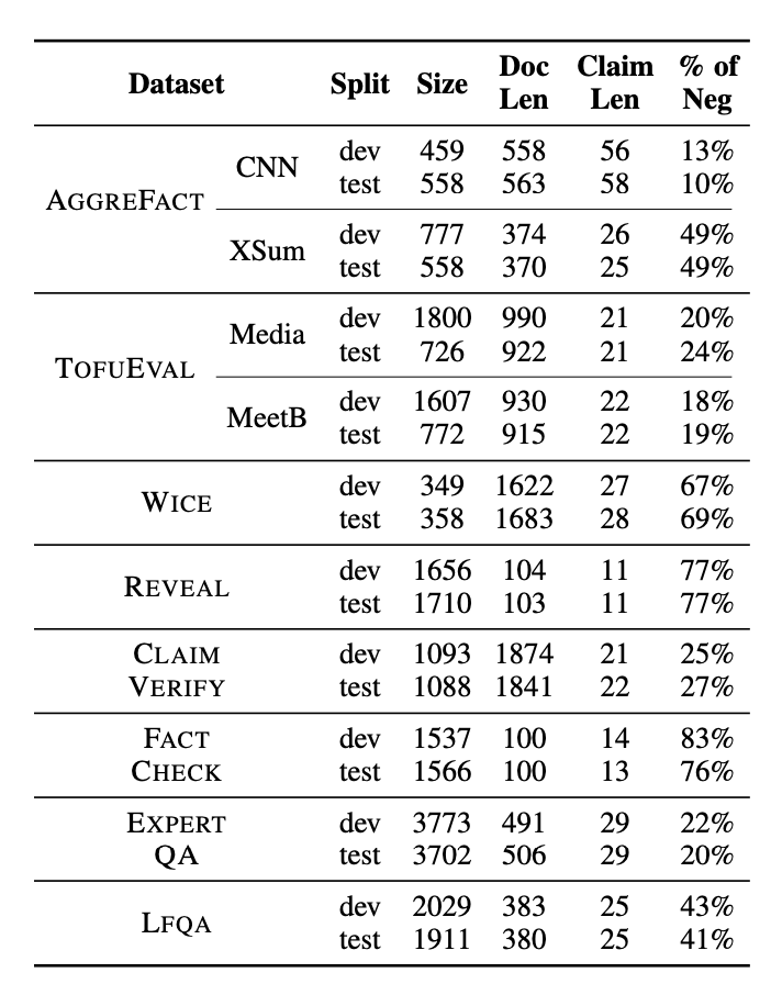 - Validation/test set split: For AGGREFACT, TOFUEVAL, WICE, and CLAIMVERIFY, the existing validation and test splits are used. For REVEAL, FACTCHECK-GPT, EXPERTQA, and LFQA, the data is randomly divided (50%/50%) to ensure unique query responses do not overlap.