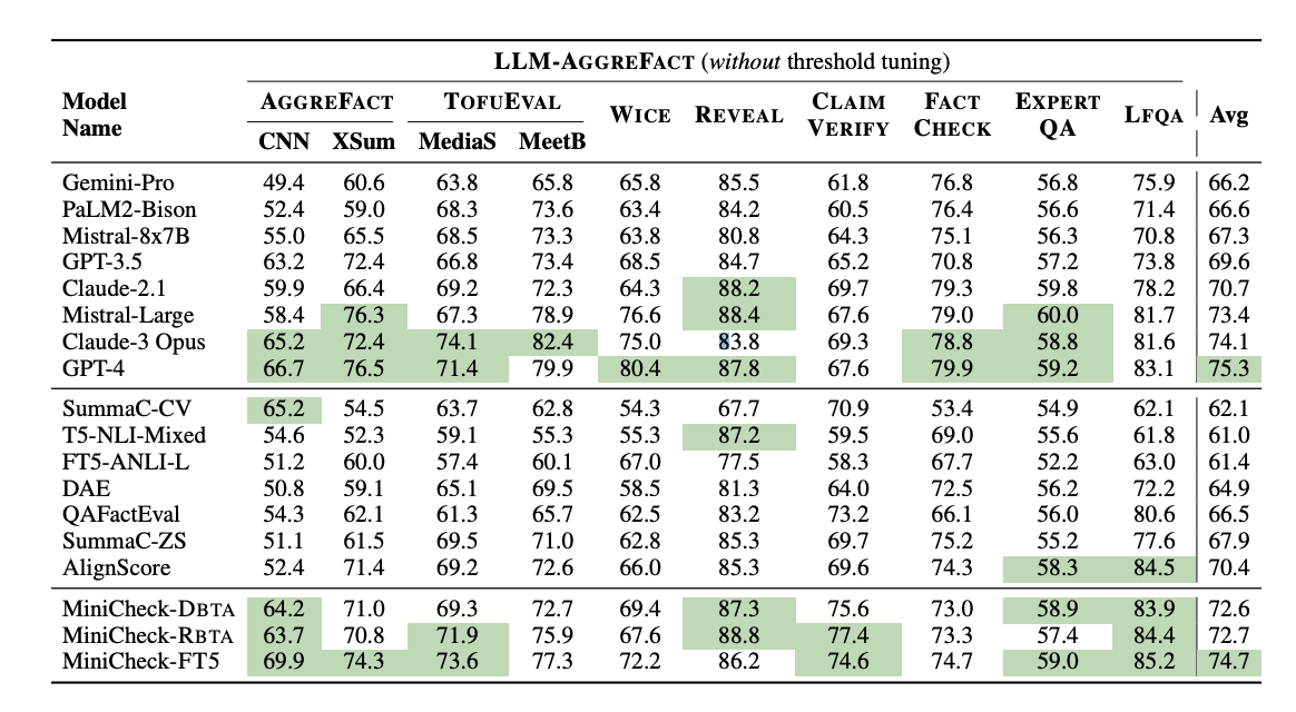 This research paper presents a significant advancement in grounding LLM outputs through the introduction of MiniCheck-FT5, a cost-effective model that matches GPT-4’s accuracy while dramatically reducing expenses. By leveraging synthetic training data generated through innovative methods, the study addresses the challenges of accuracy, efficiency, and high computational costs in fact-checking. The new MiniCheck models and the LLM-AGGREFACT benchmark offer valuable tools for evaluating and improving fact-checking performance in various settings.