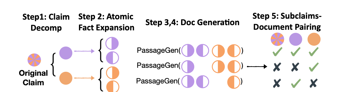 Step 5: Pairing subclaims and documents Augment the data by creating subclaims from subsets of atomic facts. Pair these sub-claims with both supporting and nonsupporting documents to create a diverse set of examples. In this step, the goal is to augment the dataset by creating more examples using sub-claims and their relationships to the grounding documents. This involves: