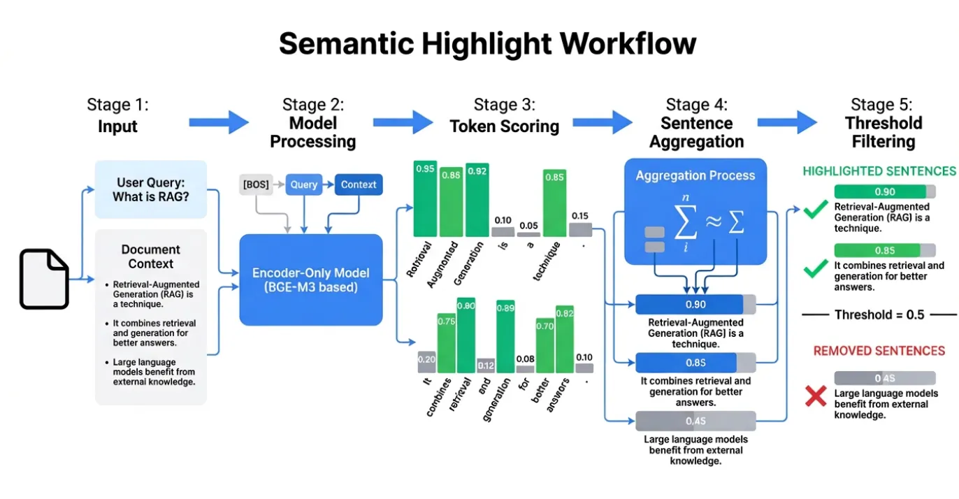 Agent Workflows: This becomes particularly valuable in AI agent systems. When agents decompose complex tasks into multiple search queries, those derived queries often look nothing like the source documents. Semantic highlighting can bridge this semantic gap.