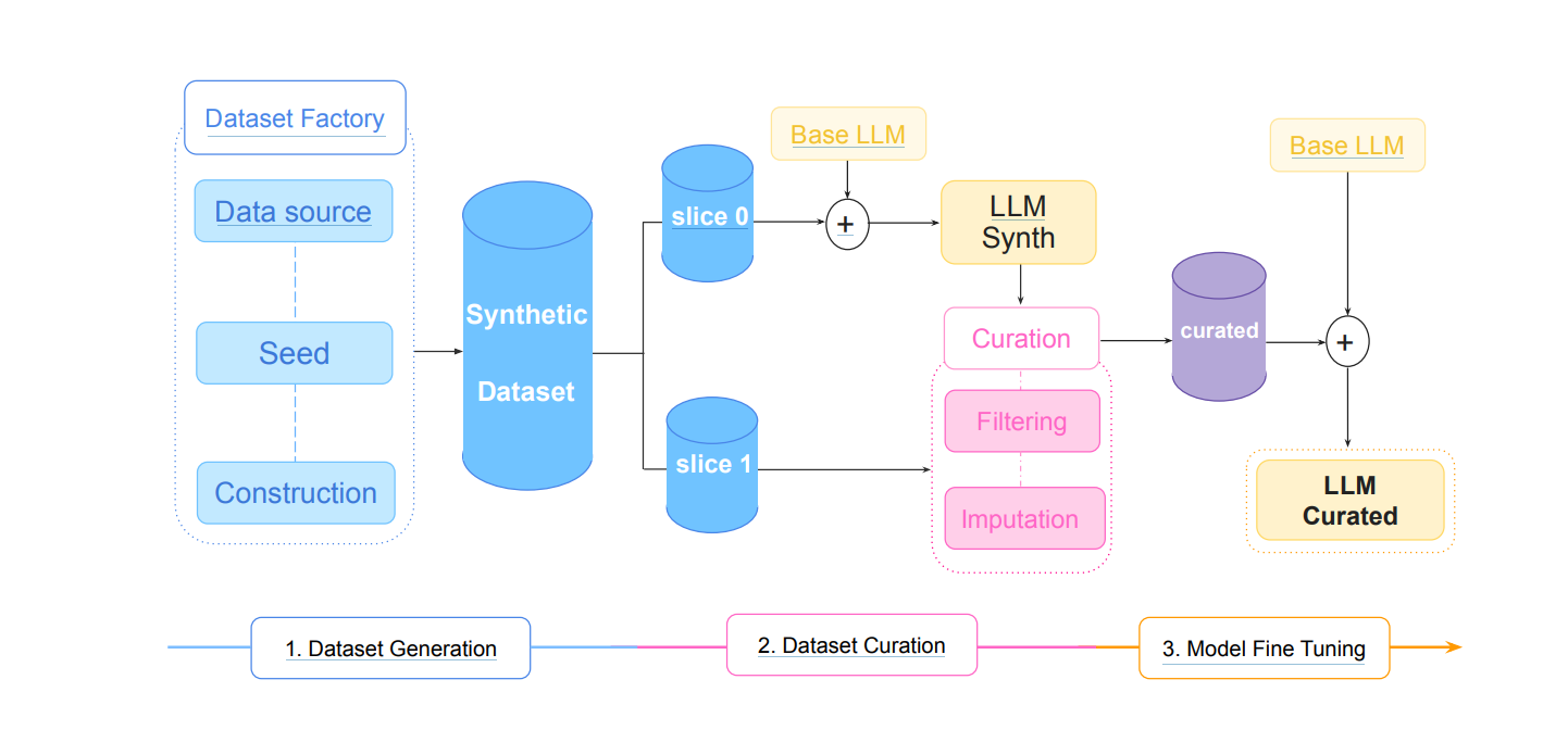 After generating the synthetic dataset, the Dataset Curation process refines it to improve quality. This is done without human supervision through a model-based approach. The dataset is sliced into two parts:
