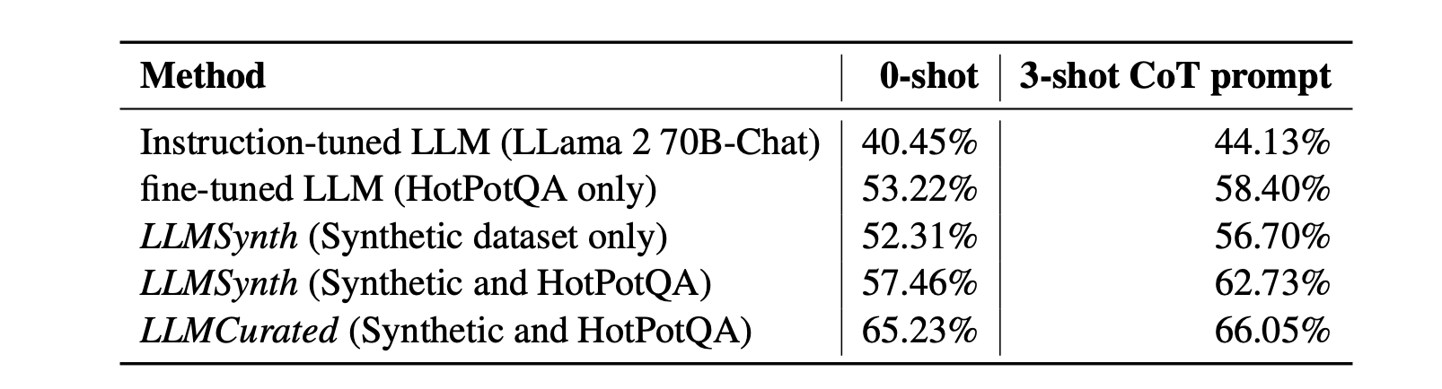 - LLMSynth (synthetic and HotPotQA): Training on a combination of uncurated synthetic data and 500 HotPotQA examples.