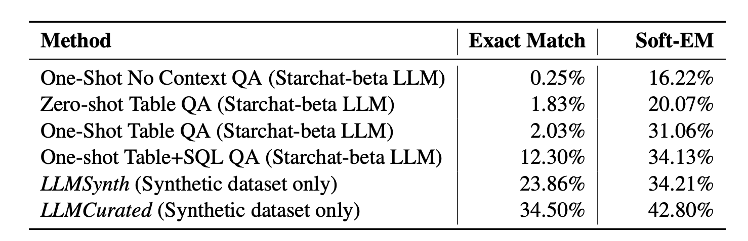 For TQA, using the WikiSQL dataset, the instruction-tuned StarChat model performed poorly without context (0.25% EM), and even when table context was provided, the improvement was minimal. However, fine-tuning with Source2Synth synthetic data drastically improved performance. The LLMCurated model achieved a 34.5% EM, compared to 23.86% for LLMSynth, demonstrating the value of the curation process in generating high-quality data for fine-tuning. Both tasks showed that synthetic data, especially when curated, enhances model performance significantly.