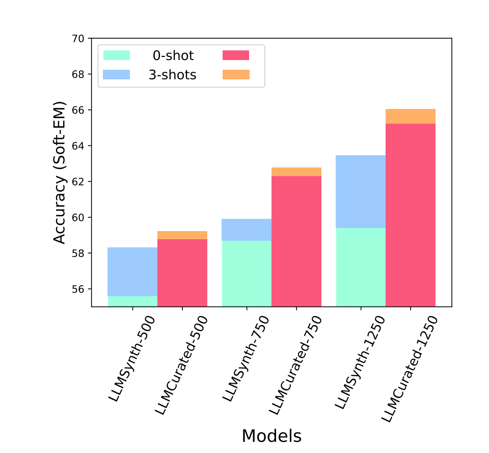 - LLMSynth (synthetic dataset only): Training on 1,250 synthetic examples from the first data slice without any curation.
