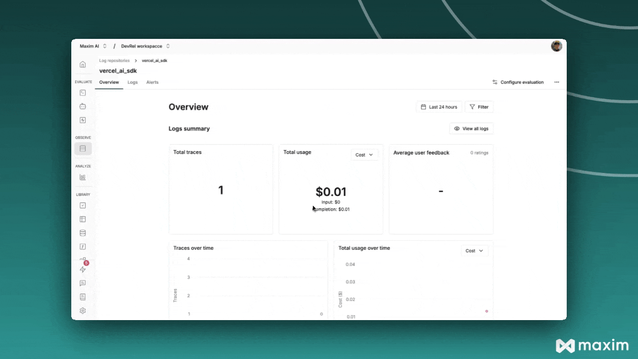 For more details, see the Maxim JS SDK documentation and the Vercel AI SDK documentation.
