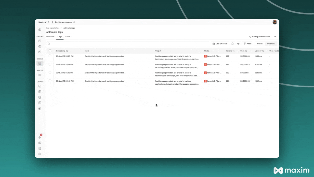 Combining async operations with streaming gives you the best of both worlds - non-blocking execution with real-time response streaming.What Gets Logged to Maxim